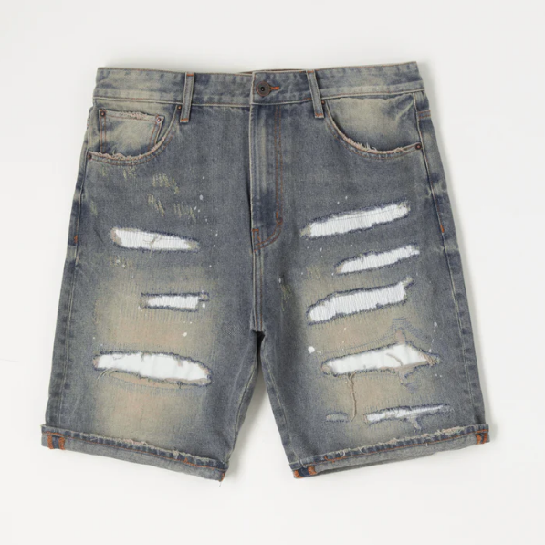 4 POCKET DENIM SHORT WITH LIGHT WASH, DISTRESS DETAILS, AND PAINT SPLATTER
